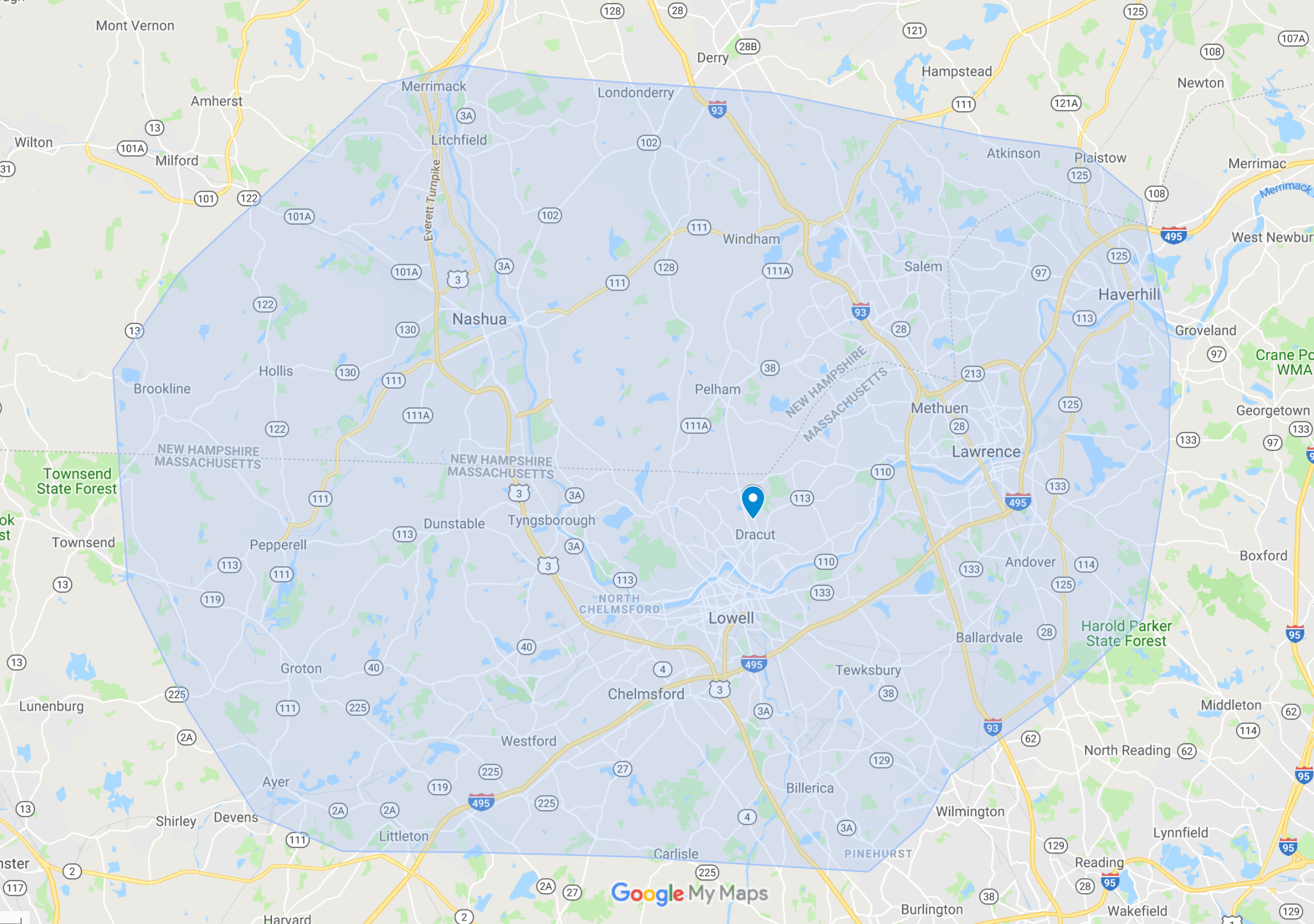 The map with the area in light blue, is a reasonable approximation of what I would consider local. Technically it doesn't cover all the Merrimack Valley but it does cover a good portion of it. I do like to be flexible so if you are not sure if you are outside my 'local' area just give me a call or send me an email and ask.